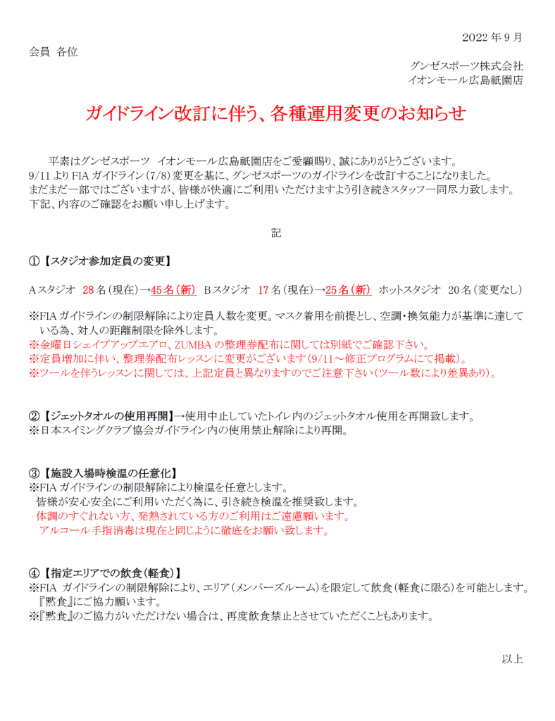 平素はグンゼスポーツイオンモール広島祇園をご愛顧賜り、誠にありがとうございます。 9/11(日)よりFIAガイドライン(7/8)変更を基に、グンゼスポーツのガイドラインを改訂することになりました。 下記ご確認をお願い申し上げます。