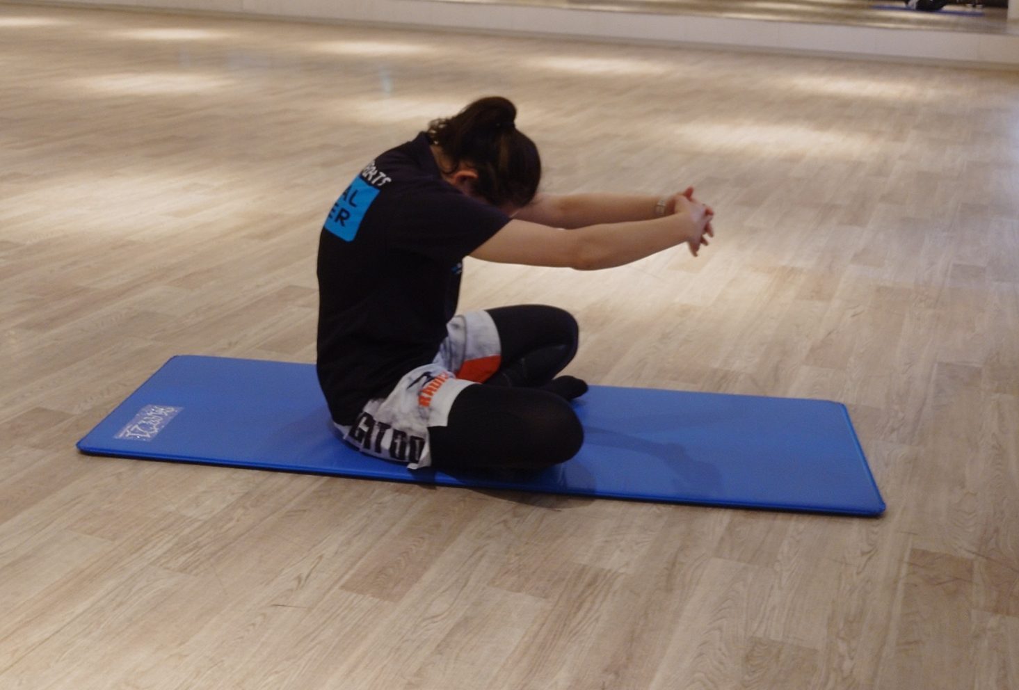 ・両手を前に伸ばし、手のひらを合わせる。