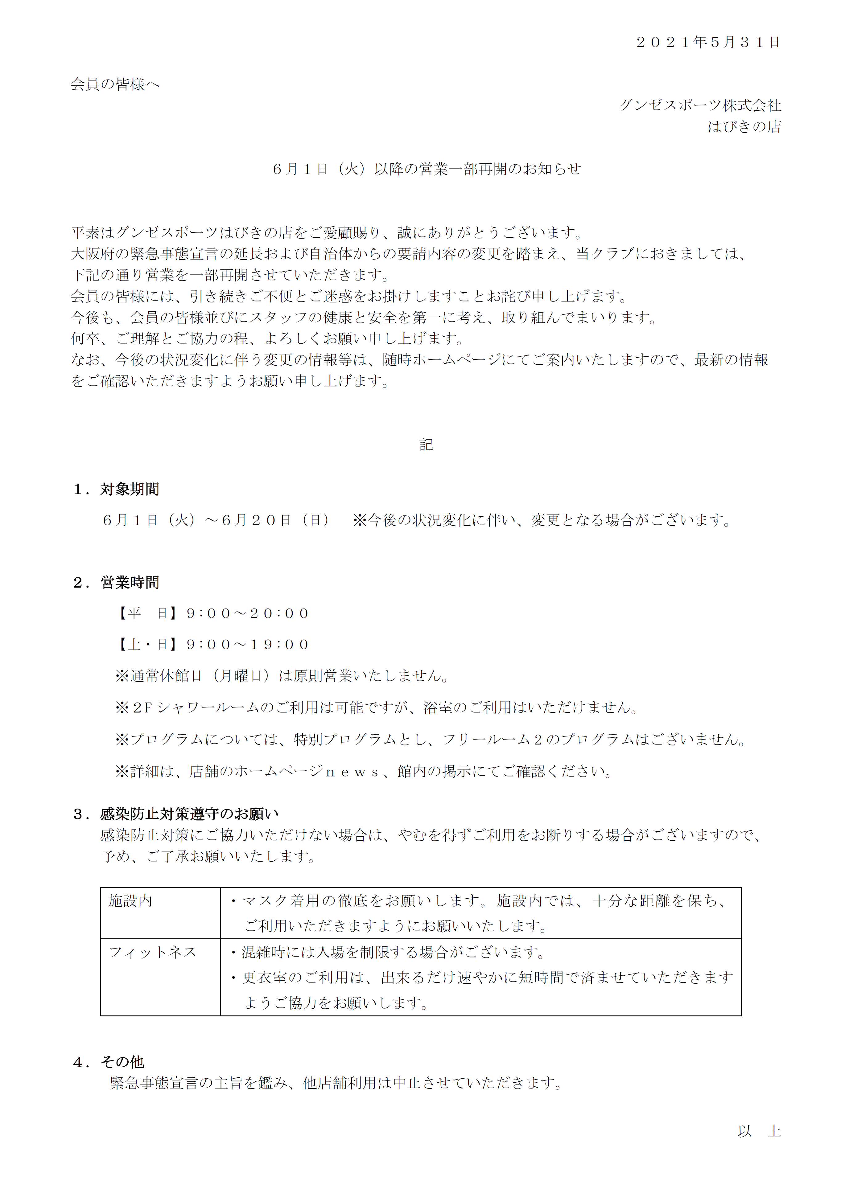 【重要】6月1日(火)以降の営業一部再開のお知らせ