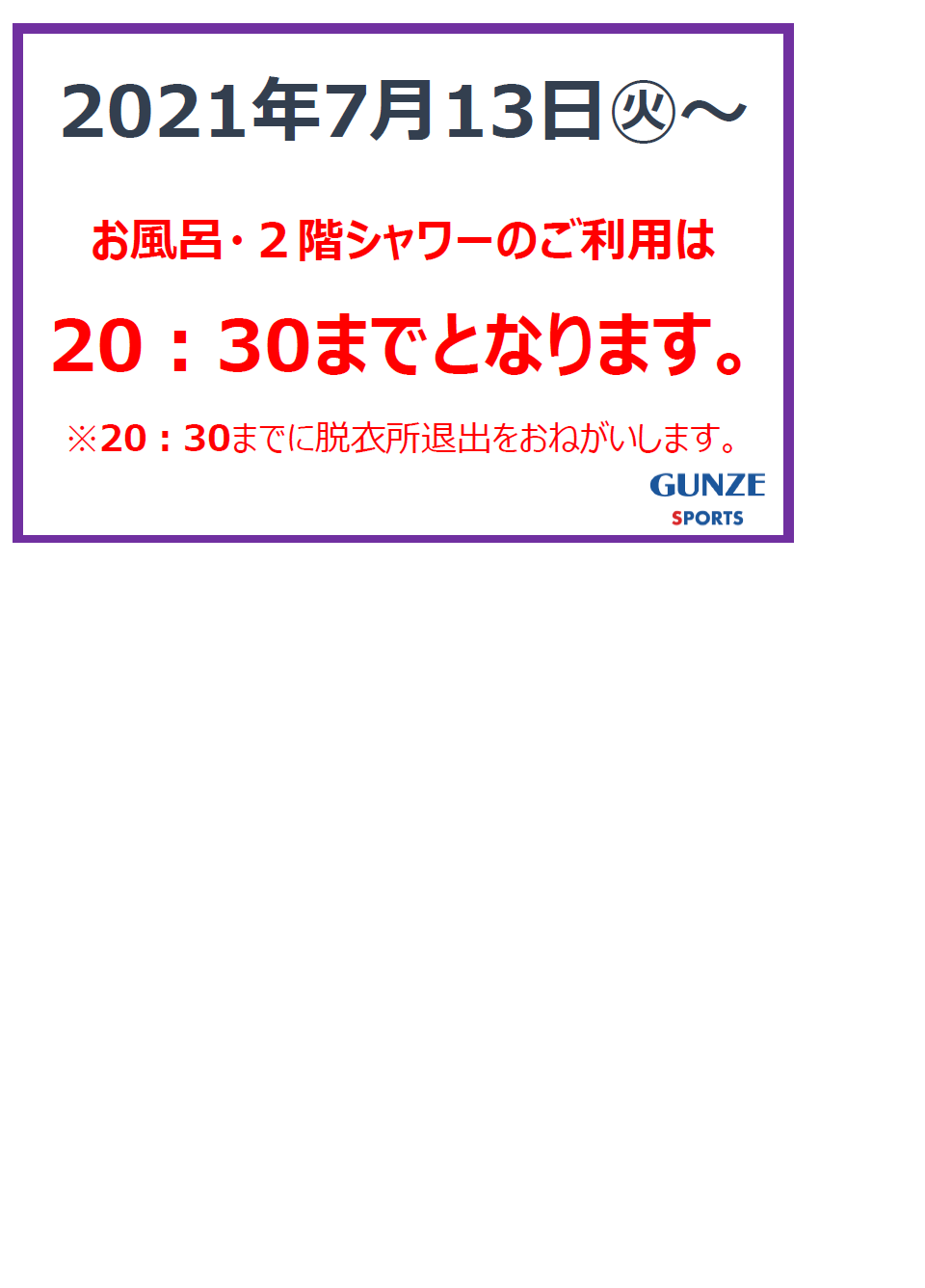 7月13日㊋よりお風呂・2階シャワーのご利用は20:30まで