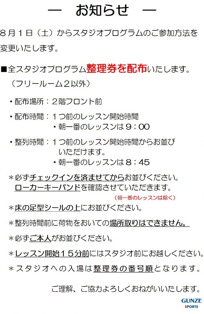 8月1日(土)よりスタジオプログラム参加方法を下記のように変更いたします。