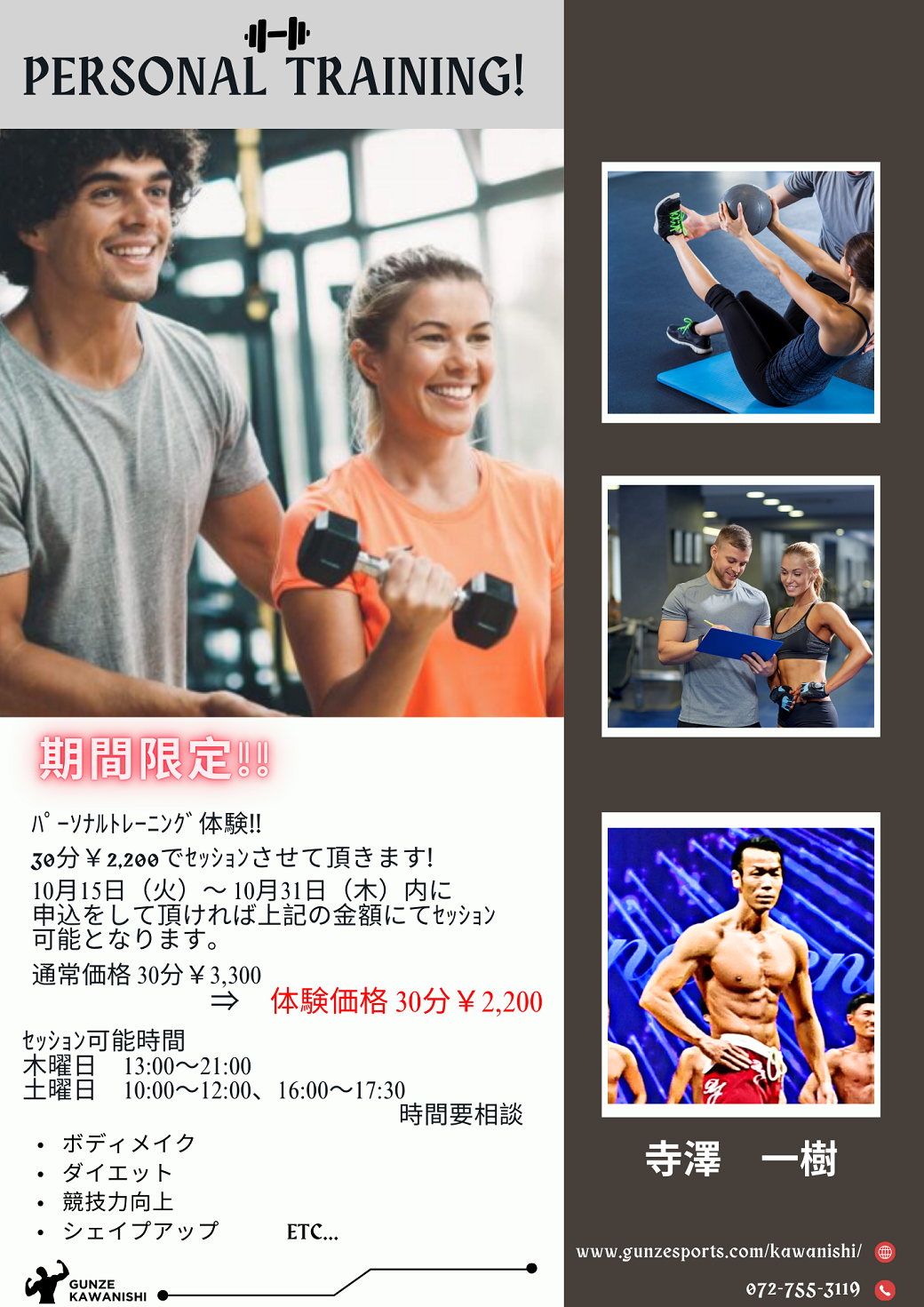 通常価格 30分¥3,300 ⇒ 体験価格 30分¥2,200 詳細は下記の項目をクリックしてください。 または、館内掲示をご覧下さい。