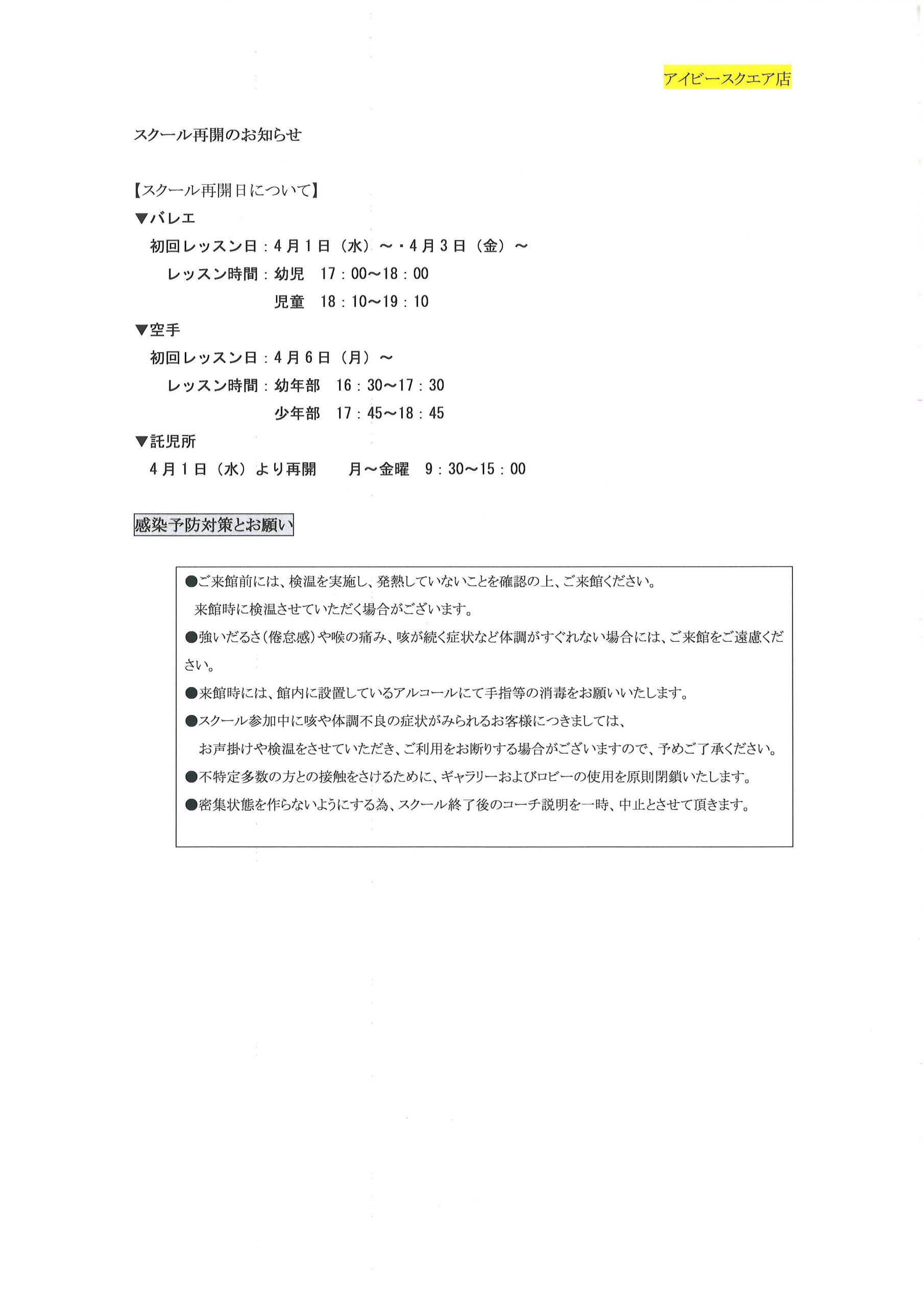 スクール再開について、下記内容のご確認をお願い致します。