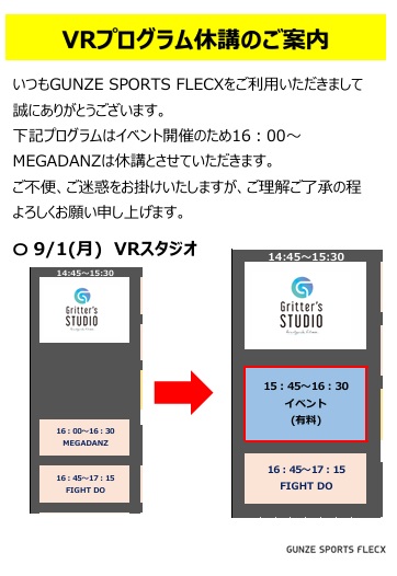 ※イベント開催に伴い9/1(月)、9/2・9/23(火)のVRプログラムに休講及び変更がございます。