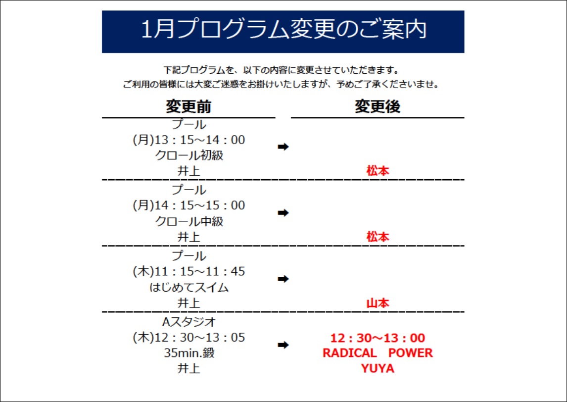 1月プログラム変更のお知らせ