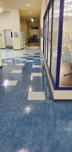 ②クラス参加前の整列中は、足元の目印に従ってソーシャルディスタンスを