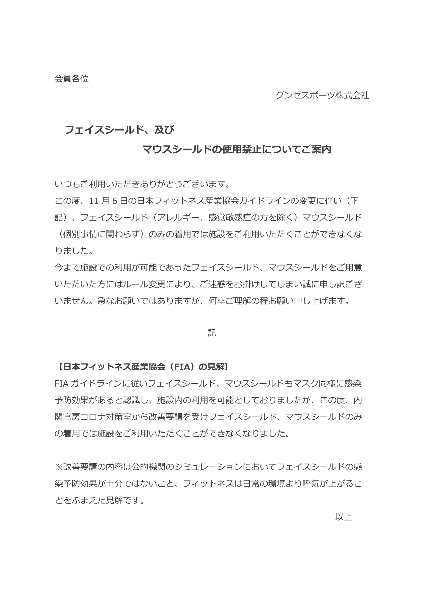 【会員様にお知らせ】フェイスシールド、マウスシールドでのご利用禁止のお知らせ(11月16日㊊より)