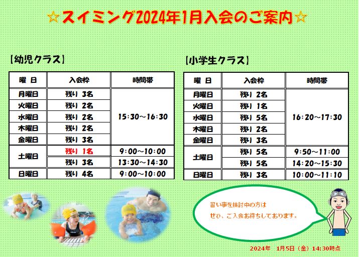 1月の入会可能クラスは店舗までお問い合わせ下さい