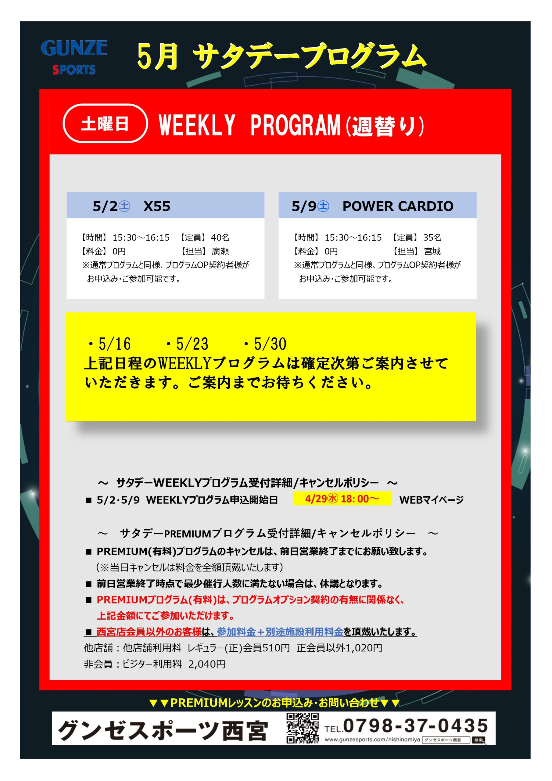 ※5/16・5/23・5/30の サタデーWEEKLY(週替わり)プログラムは 確定次第ご案内させていただきます。