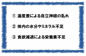 エアコンの効いた部屋と外の気温の差が激しいと、体温調整が上手くいかなくなり