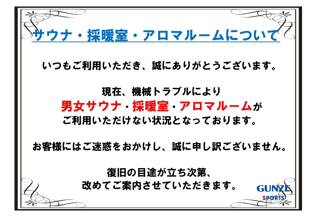 【男女サウナ・採暖室・アロマルーム不具合について】