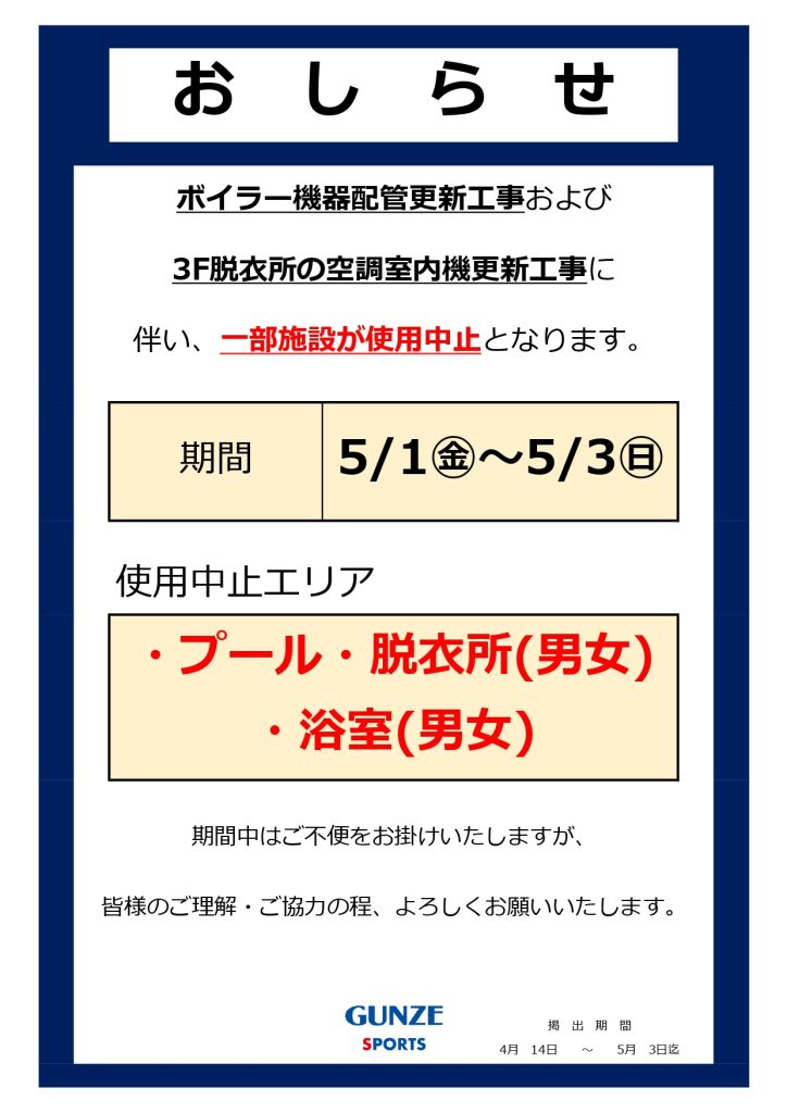 GW特別プログラムの内、3日(日)のプールプログラムも休講となります。