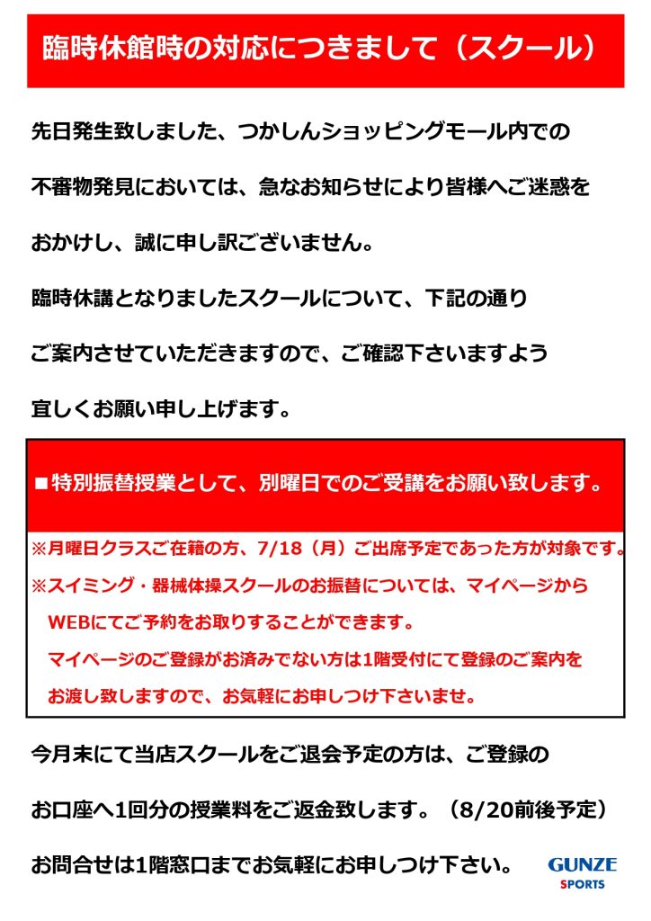 【スクール】7/18臨時休館時の対応につきまして