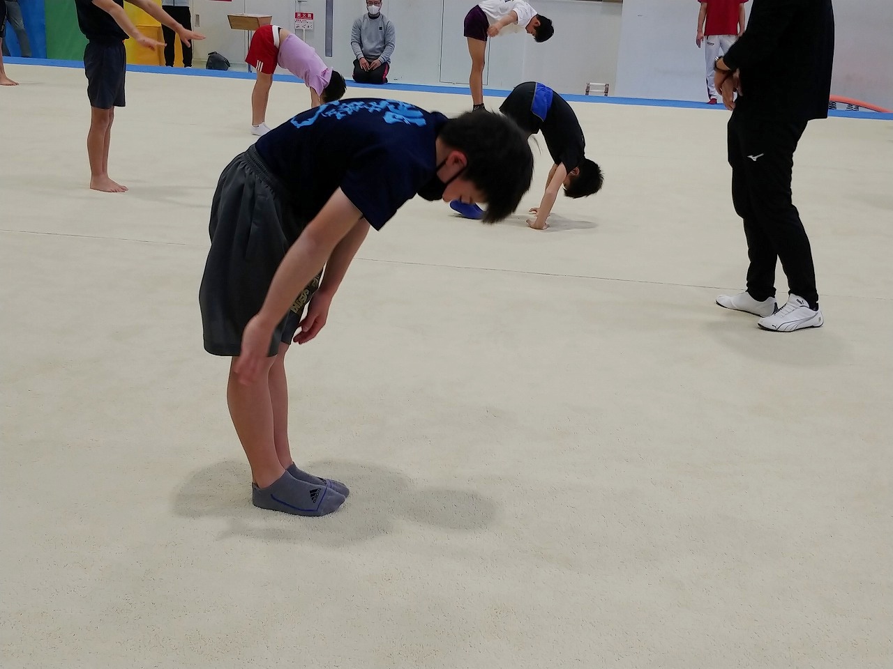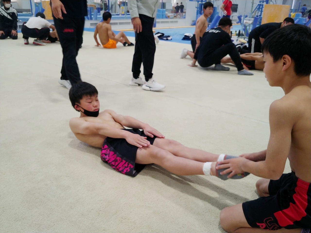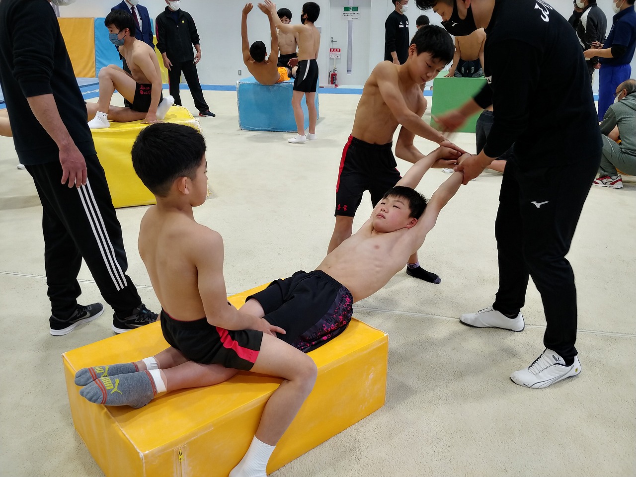 初日から日本体操協会強化部員の先生方から細かい姿勢やトレーニング方法、練習方法の指導を受けつつ、時間をかけて体づくりをしていく大切さを教わりました。
