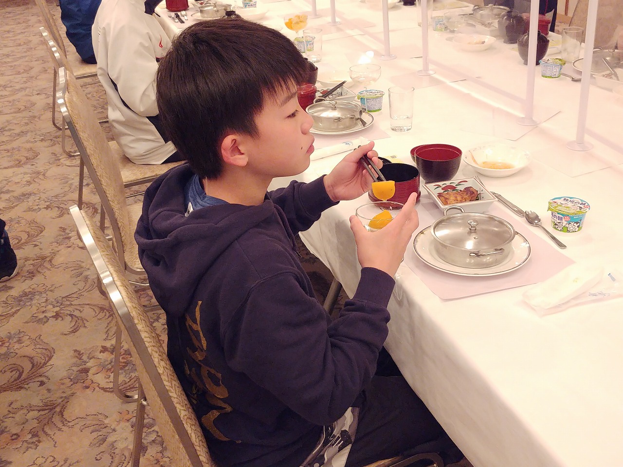 朝食中です 朝一は田中佑典選手の講習会です 全体W-UP