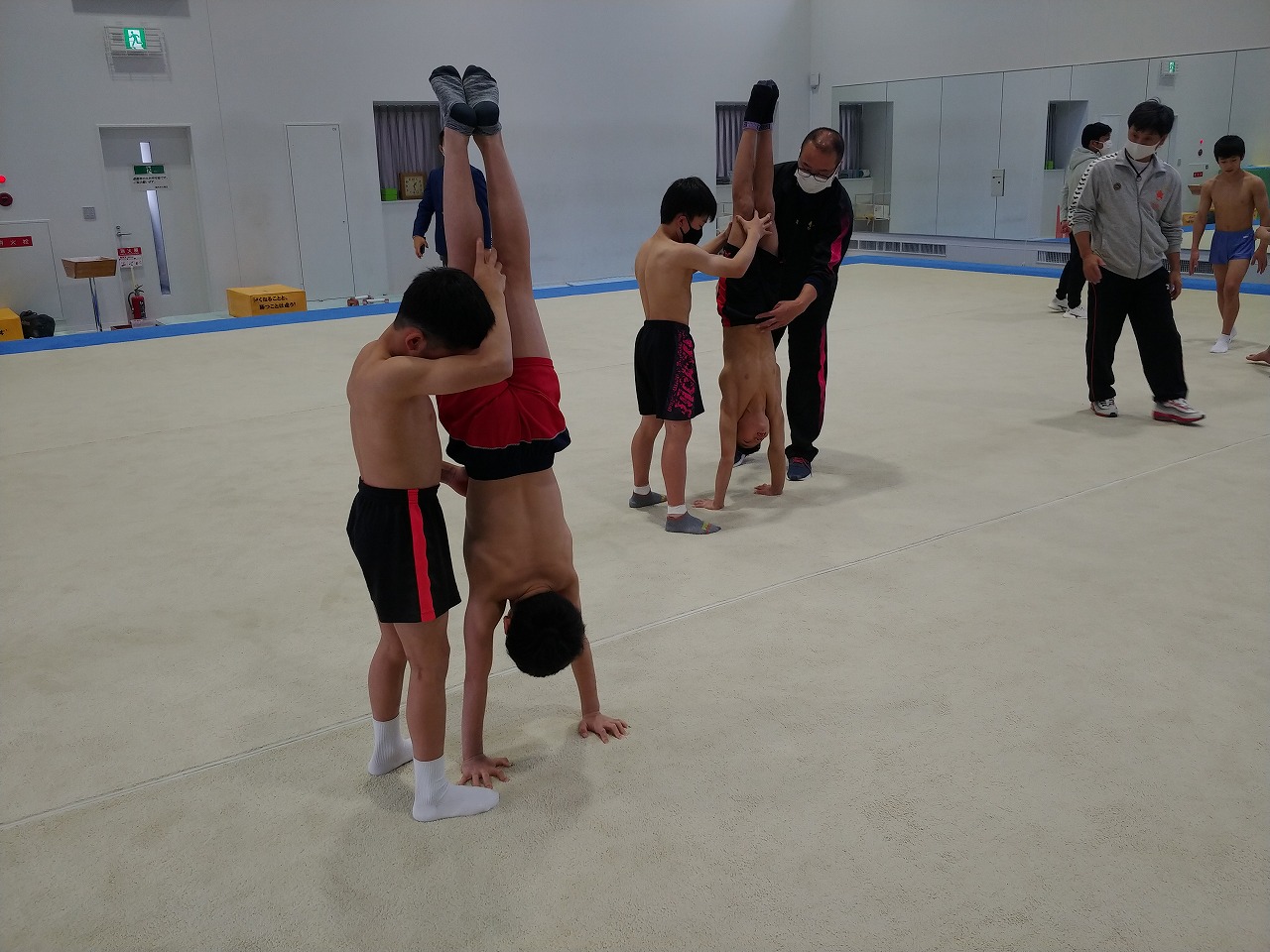 倒立の姿勢確認から どこに力を入れて締めを作るか 強化部の先生方にも指導頂きます