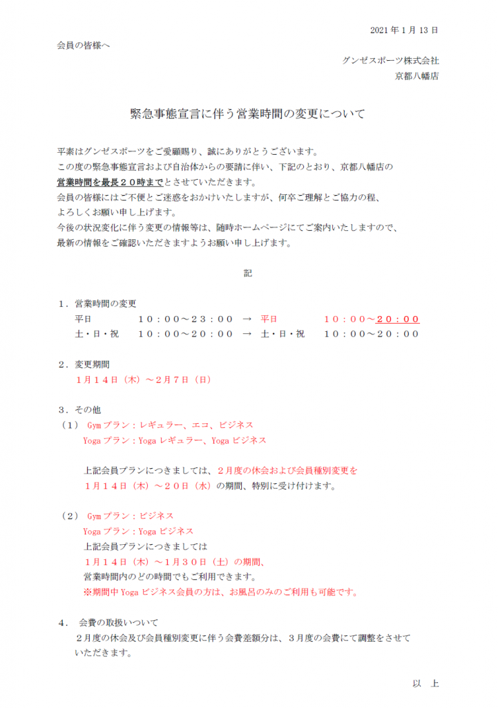 この度の緊急事態宣言及び自治体からの要請に伴い、