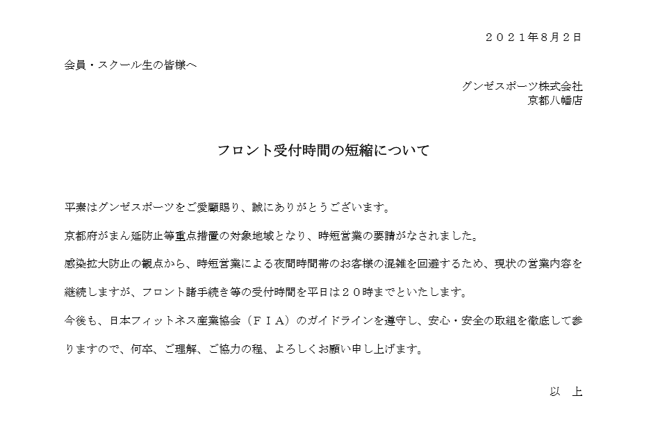 まん延防止等重点措置に伴うフロント受付時間の短縮について(8/2更新)