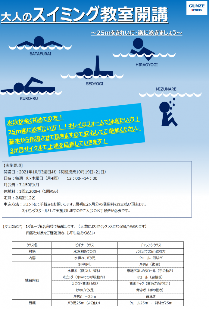 グンゼスポーツ京都八幡では、大人の方を対象とした