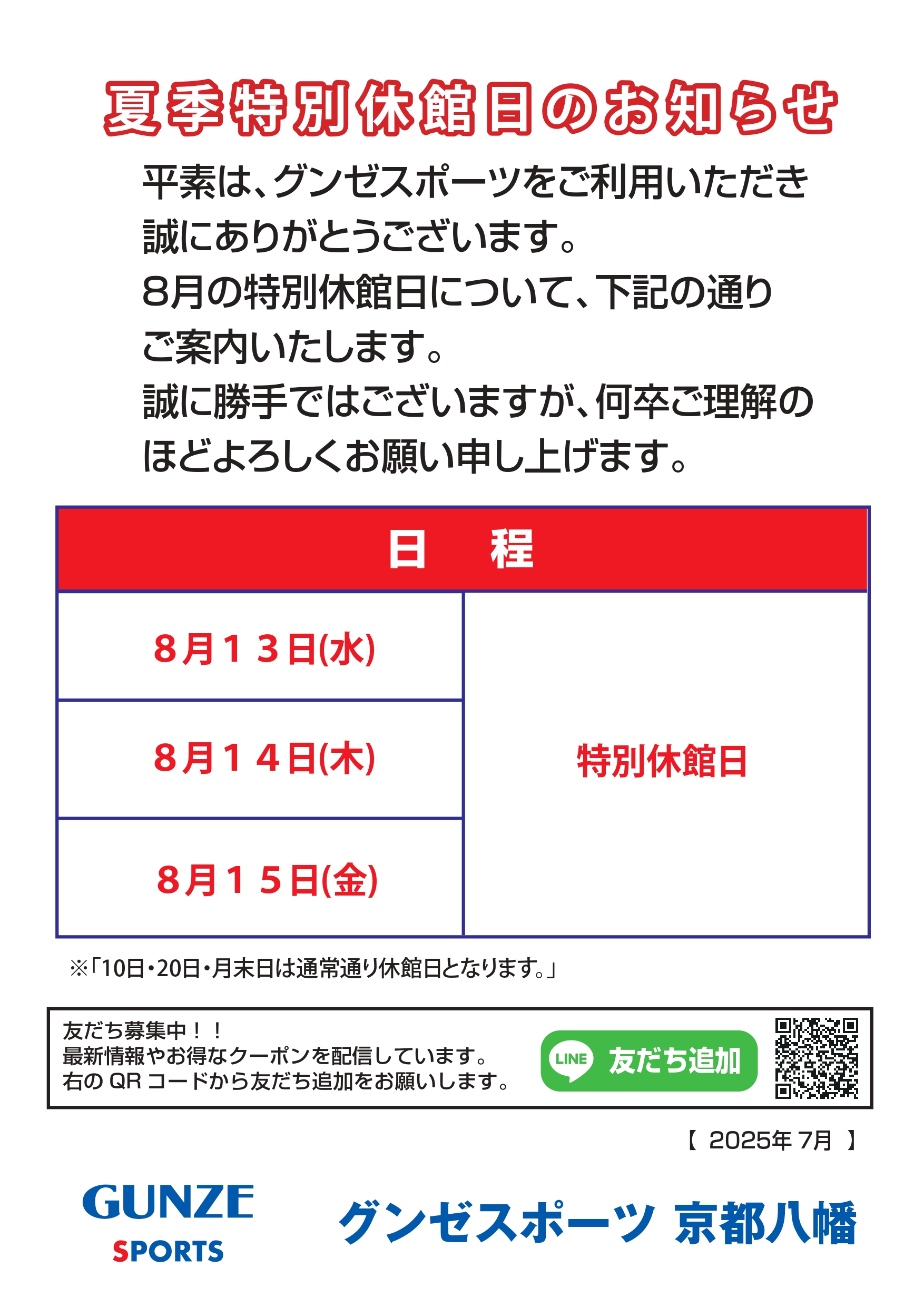 平素は、グンゼスポーツ京都八幡をご利用いただき